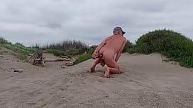 Esclavo blanco patético y desnudo, siempre enjaulado y con correa en la playa gay, follando con pepino y arena, CMNM 5 min